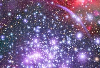 Esta impresión artística muestra cómo el cúmulo estelar Arches aparece desde el interior del centro de nuestra galaxia, la Vía Láctea. Oculta a nuestra vista directa, el cúmulo masivo se encuentra 25.000 años luz de distancia y es la más densa de reunión conocida de estrellas jóvenes en nuestra galaxia.