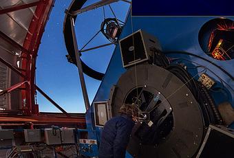 ¿Alguna vez has querido mirar por el ocular de un gran telescopio en el espacio ? Si pudierais, verías una nítida imagen limitada por la difracción . Sin estar afectada por la emborronamiento atmosférico que fastidia a los observadores terrestres, la resolución angular de la visión limitada por la difracción estaría determinada sólo por la longitud de onda de la luz y el diámetro de la lente o del espejo del telescopio; cuanto mayor es el diámetro, más nítida es la imagen. Esta fotografía tomada en el suelo muestra la utilización de un nuevo sistema de óptica adaptativa (maga) para neutralizar el emborronamiento atmosférico durante la observación del famoso sistema estelar binario Alpha Centauri . El astrónomo Laird Close prueba el sistema con el telescopio Magallanes Clay de 6,5 metros de diámetro del Observatorio Las Campanas y disfruta de una imagen histórica de difracción limitada (en el recuadro) y de la amplia separación aparente del sistema estelar binario... sin tener que viajar a una órbita baja.