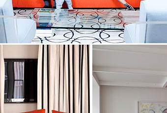 Es muy fácil y divertido aliar elementos contemporáneos con otros más clásicos y que los tejidos calientan la atmósfera. Permiten también esconder los objetos que no queremos ver (la gran cortina del salón detrás del sófa esconde nuestra televisión, los juguetes de nuestro hijo y la bodega) o de cerrar un espacio: en nuestra habitación que está abierta al salón, hemos colocado una cortina para conservar un poco de intimidad. En nuestro vestidor no hemos puesto puerta pero un tejido, Mauritius, muy alegre con palmeras que iluminan la sala.