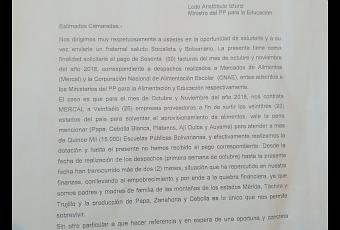 Es por ello, que Vásquez y los productores de los Andes venezolanos han procedido a hacerme llegar la denuncia de que Mercal y la Corporación de Alimentación Escolar (CNAE) estarían siendo explotados por parte de estas instancias, este colectivo despacharía a más de 15.000 escuelas bolivarianas de la región, pero que hasta ahora no habrían podido cobrar, afectando a más de 800 productores. Procedo, como me lo indica esta persona, a publicar las imágenes de sendas cartas que me fueron enviadas, una al Presidente de la República Bolivariana de Venezuela, Nicolás Maduro Moros, y la otra dirigida al presidente de la Asamblea Nacional Constituyente, Diosdado Cabello, con copia al ministro del poder popular para la alimentación, M/G Luis Medina Ramírez, y al ministro del poder popular para la educación básica y vicepresidente sectorial del área social, profesor Aristóbulo Istúriz Almeida, a través de mi correo electrónico.