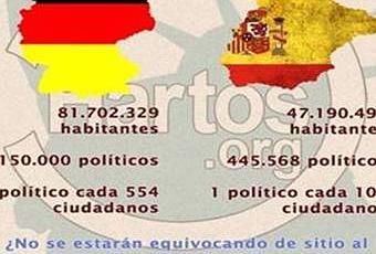 Alemania, con 81.702.329 Habitantes tiene 150.000 políticos mantenidos por el Estado y España, con 47.190.493 habitantes tiene 445.568 políticos a cargo del erario público. Si aplicamos a España el modelo alemán y hacemos una regla de tres simple, a nuestro país le correspondería mantener a 86.638 políticos, lo que le permitiría ahorrar cantidades inmensas de dinero, más que suficientes para que lo peor de la crisis desapareciera o al menos dejara de ser tan terrible y dañina: