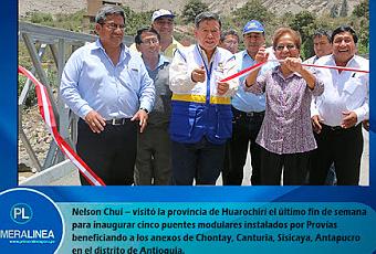 Durante inauguración de puente modular el titular del pliego -. Nelson Chui también anunció la construcción de represas en esa zona alto andinaLuego de exhortar a la población alto andina a trabajar en equipo para salir adelante, el gobernador regional de Lima Nelson Chui Mejía, anunció la ejecución y próxima inauguración de obras que mejorarán considerablemente las condiciones de vida de los comuneros de la provincia de Huarochirí.