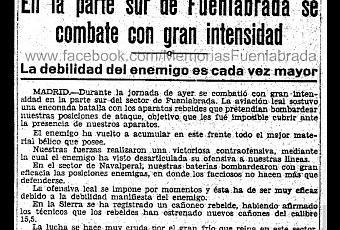 Articulo aparecido en el diario El Liberal el 3 de noviembre de 1936. Comenta que el día 2 hubo una gran intensidad de combate en la parte sur de Fuenlabrada y que hubo bombardeo de aviación realizando una victoriosa contraofensiva .