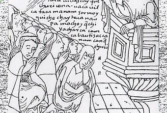 El inglés dice: "Nosotros dibujamos una raya, lanzamos las monedas al aire. Las que van a la derecha para dios, las que van a la izquierda para la parroquia".