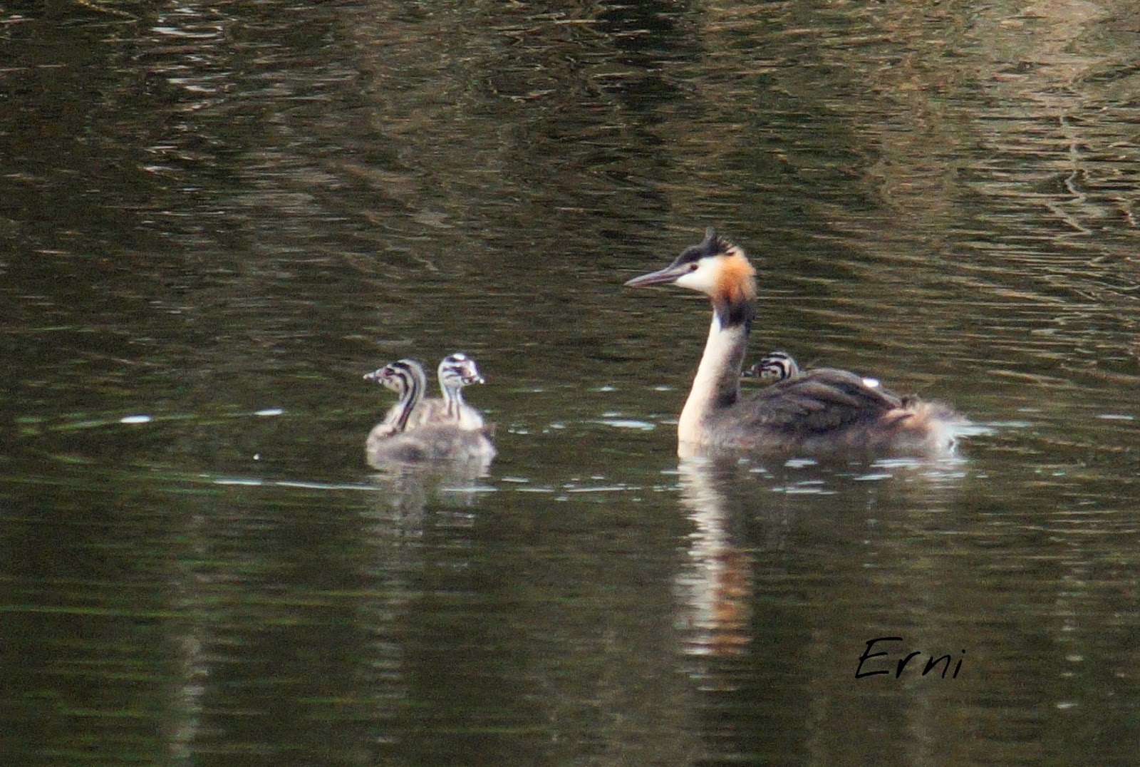 Somormujo lavanco (Podiceps cristatus)Muy confiados con sus 3 pollitos.