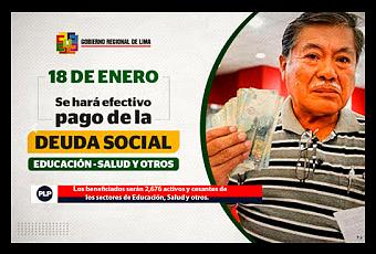 Una buena noticia. El Gobierno Regional de Lima hará efectivo el pago de la Deuda Social, a partir del lunes 18 de enero hasta el 22 de febrero del año en curso.