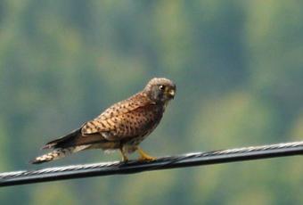Con la actividad de las máquinas un montón de pequeños animales son obligados a salir de sus refugios: insectos, reptiles, micromamíferos...el pequeño cernícalo aprovecha la circunstancia. Y demuestra ser particularmente hábil, en uno de sus picados de caza desde el cable al suelo captura lo que parece ser un pequeño ratón o una musaraña, tras darle unos golpes para matarlo lo devora en un momento.