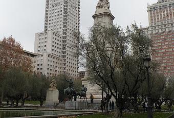escribió cuando le dije que me contase lo que más le gustó."Mi experiencia mas agradable sucedió en la Plaza España, podía llegar ahí caminando desde el hotel donde me hospedaba y era ahí donde cada tarde esperaba a mi amigo Luis Miguel para irnos de paseo por las calles de Madrid caminando horas y horas. Me sentaba en una de las bancas en donde puedes ver de frente al Quijote y Sancho Panza, esculturas resguardadas (irónicamente pensaba) por edificios enormes, tan grandes como los gigantes contra los que peleaban en la novela de Cervantes. Todos los días que me senté ahí, estaban también 3 señores adultos, yo creo que entre 65 y 70 años, elegamente vestidos, y entre refranes y vivencias, me hacían participe de sus conversaciones tan agradables como ellos. Por supuesto mi espera se hacia ligera y muy amena. Llegó el momento de volver a México y estando acá después de unos días, recibí un mensaje de mi amigo Español, textualmente decía.. "María, hoy pasé por la Plaza España, por el lugar que ya sabes pero no estabas... en cambio estaban como siempre ahí tus tres amigos, deberías volver, si no es por mi, vuelve por ellos...." desde entonces... extraño significativamente volver a Madrid y sabes que??? para mi si es la Ciudad más bonita y amable de Europa! Saludos.."