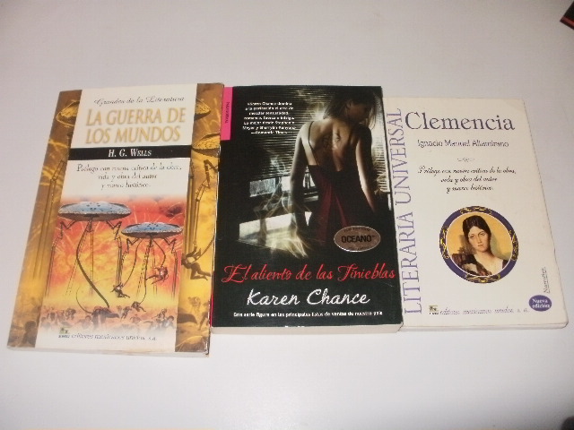 La guerrade los mundos me lo encontré en una pequeña feria del libro en mi estado a muybuen precio. AQUÍ pueden leer la reseña. Clemencia lo leí en la secundaria parala clase de Español y bueno, me gustó mucho, fue uno de mis inicios, solo queno tengo reseña x_x y debería. El aliento de las tinieblas me lo gané hace pocoen el blog de Kyra (muchas gracias) y ¡bueno! Que pronto le tocará el turno.Y bueno, son todos por este EME. Son pocos y viejos lamayoría (viejos de que los tengo, no de el formato y eso) pero ya vendrán otrosEME con más libros (? Como de unos libros que ya reseñé y no he mostrado xD