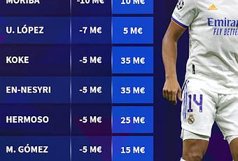 Casemiro y Moriba, con 10 millones de euros cada uno, son los jugadores que más han bajado su valor de mercado, aunque en la lista nos encontramos con otros futbolistas ilustres como Koke y Maxi Gómez.