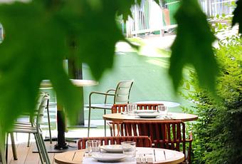 Su amplia terraza-jardín de 600 metros cuadrados se encuentra rodeada de árboles, vegetación frondosa, parterres y mesas de madera, creando así un oasis verde en medio del bullicio urbano.