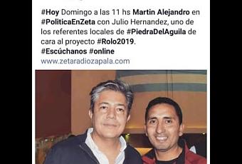 En un programa periodístico político que se emite los domingos por radio Z de Zapala, habló Julio Hernández. El mismo sería uno de los posibles "Pre candidatos" a intendente para representar la línea de Rolando Figueroa en Piedra del Águila.Nota: el audio NO es de buena calidad aunque es audible.-