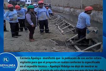 Tras expresar que la población de ese sector estará vigilante para que el proyecto se realiza conforme lo especificado en el expediente técnico – Apolaya Hidalgo no dejó de mostrar su satisfacción por el inicio de esta obra espera por más de tres décadas.Informó que son más de 600 familias las que se beneficiaran con este trabajo financiado por el Ministerio de Vivienda y Construcción y que contribuirá a mejorar la calidad de vida en esta parte del distrito capital.“Esta obra comprende la construcción de pistas y veredas, sardineles y jardines”, continuó diciendo – tras reiterar el agradecimiento al parlamentario Yonhy Lescano por su apoyo como ex titular de la Comisión de Vivienda en el Congreso en el año 2015.Por ultimo –dijo que la culminación de las faenas esta proyectada para fines del diciembre del año en curso.