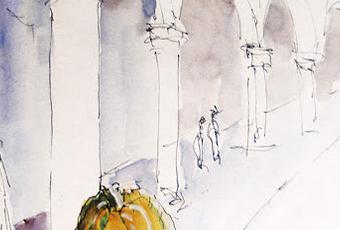 Inevitable recordar "Amanece que no es poco", de mi paisano Cuerda, reunidos esta vez en pictórico concilio de cuadernícolas alrededor de una calabaza de 89 kilos, justo al lado de la catedral, bajo unos soportales llenos de mesas de los bares y a salvo de la lluvia, fuerte en el primer día. La puerta del almacén de uno de ellos está coronada por el escudo del Cardenal Mendoza, que él fue quien levantó muchos de los más notables edificios de Sigüenza, cosa que nos recuerdan hermosos azulejos en las esquinas o losas en el suelo. Una de ellas nos informa de que esta plaza era zona habitada por el clero, lo que mi carácter episcopal, con creciente tonsura, agradece. Como si estuviera en mi convento de San Odón de la Muela. El dibujo de los arcos con la calabaza fue el último que hice allí, el domingo antes de salir de vuelta. El que sigue fue el primero, prácticamente desde el mismo sitio, recién llegados, con café y pacharán y los primeros encuentros, después de comer en La Alameda. Aunque acudió mucha gente a este encuentro, para reconocernos no necesitamos mostrar una flor en el ojal, que por la pluma y el cuaderno se nos conoce, precaución que tuvo, según recuerdo, el ilustre amigo Fernando Font de Gayà en Cuenca, primer encuentro de Ladrones de Cuadernos.