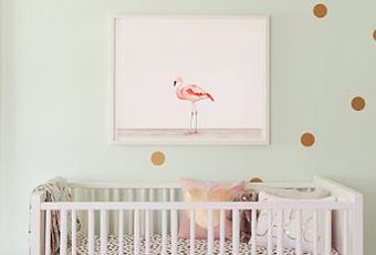 Aunque no lo parezca, estos días tan calurosos, pasamos más horas de lo común en casa, para evitar las horas centrales y buscar en su interior nuestros pequeños paraísos refrescantes. En esta ocasión os presentamos una habitación de bebé que, gracias a textiles frescos y colores adecuados, muestra que el noretnic y el verano son más compatibles de lo que pensamos. Unas cuantas pinceladas doradas bastan para darle un cambio radical al dormitorio, una bonita lámina con un flamenco, y un gran kilim que combina los tonos pastel de una forma delicada. Se trata sin duda de un espacio sugerente y atípico, decorado con una buena dosis de optimismo. Seguro que están encantados!!! the animal print shop Nos gusta especialmente la elección del pouf marroquí en color natural, tan parecido al que tenemos disponible en dar amïna SHOP.