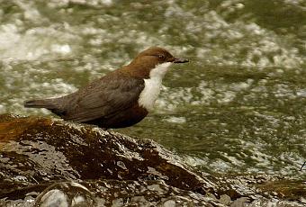 Un mirlo acuático descansaba en un tronco caído por la fuerza del río, muy común en estas fechas debido a la típica crecida primaveral en la que se unen las lluvias de abril al deshielo de las altas montañas y que arrastran con todo a su paso.