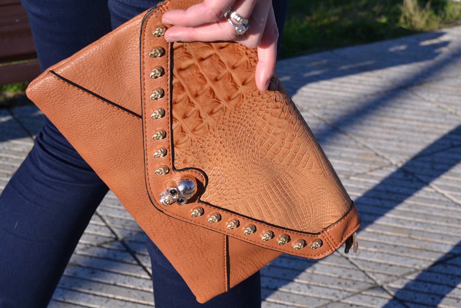 Los complementos fueron este sobre de piel de calaveras para no perder mi aire rokero y como joyas el llamador de angeles en degradados y las chinchetas con el centro en nude que tanto os gustan.