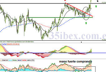 El viernes Enagas rompió resistencias dando una nueva señal de compra, ya que estamos nuevamente en subida libre.El Knocorde muestra claramente entrada de mano fuerte. El MACD semanal se ha cortado alcista por encima de su línea de cero y el MACD diario también se ha cortado al alza y está por encima de cero. El volumen aumentando paulatinamente.Creo que la ruptura se puede considerar válida.¿Qué hacer ahora?
