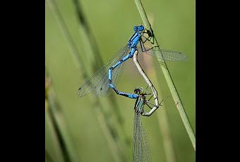 "Especie distribuida por la totalidad de Europa, Asia y América del Norte. Común en la Península Ibérica aunque no abundante. Los adultos vuelan entre mayo y agosto. En la imagen, una cópula de este odonato."