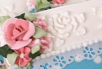Luego colocamos las flores rosadas que habíamos hecho en royal icing (ver video de cómo hacer las rosas) con un poquito del mismo royal icing y finalmente pusimos el encaje de papel comestible o wafer paper. Puedes conseguir estas hojas de papel de azúcar que se usan para imprimir en papel comestible en Amazon.