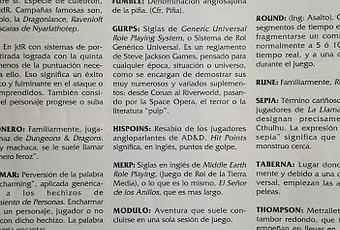 Ha cambiado mucho las cosas, pero aun recuerdo cosas como esta, solo que nosotros muchas cosas de estas no las decíamos, o decíamos diferentes. Por ejemplo, a Cthulhu jamas lo llamamos "Sepia"...era "Chipirón" (O como es en mi tierra "Txipirón" o "Txipi"), nunca usábamos la palabra Morterada y y las ballesta y la cota de malla eran siempre el "arco X y el correo cadena". Y la jerga que usaban mi hermano y sus colegas tampoco era esa...