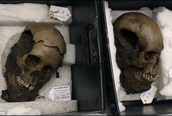 Los cráneos están en buenas condiciones pero agrietados a ambos lados, posiblemente debido a la estaca de madera que los atravesaba para que pudieran ser colocados en un soporte.