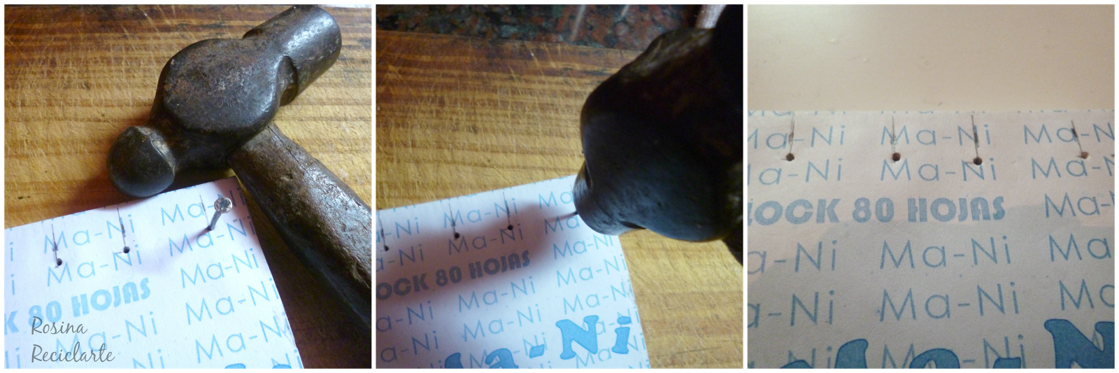 Usé clavo y martillo para perforar; y a falta de guillotina (para cortar prolijitas las hojas) bien sirvió un block de los más pedorros de la librería del barrio,de paso ya venían las páginas semi pegadas y no tenía que matarme cuidando que no se me corrieran de lugar las hojas.