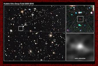 Hasta ahora, los astrónomos habían localizado galaxias con un desplazamiento hacia el rojo en torno a 8, lo que indicaría que habrían nacido unos 600 millones de años después del origen del Universo.