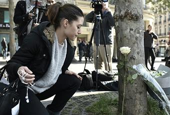 Varias personas depositaban flores al pie de un árbol, frente al edificio delante del que un policía murió el jueves por la noche en el ataque reivindicado por el grupo yihadista Estado Islámico (EI).