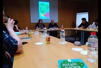 Yo no soy de hablar (me da mucha vergüenza cuando no conozco al resto), así que me dediqué a escuchar con fascinación todo lo que contaba Merche. Nunca he hablado con nadie que haya conseguido publicar un libro, y en este caso me producía mucha curiosidad el saber cómo se organizan ella y Fátima para escribir un mismo libro y que apenas se perciba que son cuatro manos las que teclean. La duda quedó respuesta nada más empezar la charla: una escribe, la otra escribe encima y, más tarde, la primera vuelve a escribir. Además, y como curiosidad, Fátima (la de los finales felices) hasta Instant Karma siempre había “encarnado” a las protagonistas femeninas, mientras que Merche (la macabra) había hecho lo propio con los chicos; en este libro intercambiaron los papeles, y fue Merche la que decidió el final de una historia que tiene mucho de ella.