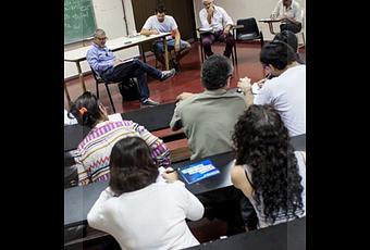 Los diputados Carlos Heller, Eduardo Seminara, Liliana Mazure, Guillermo Carmona asistieron al cierre de la jornada. A la derecha los escolta el decano de Sociales, Glenn Postolski. Foto original publicada en el blog de Heller.