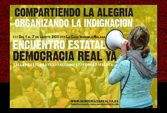 Del 1 al 7 de agosto Málaga acogerá a miembros de Democracia real YA de las diferentes partes del Estado para tratar de contestar esa pregunta, para trabajar en modos de articulación estatal, para celebrar foros públicos, debates, talleres, charlas, acciones reivindicativas y actividades lúdicas. Si está siendo un verano caluroso, no lo será menos el otoño que se avecina, ahora que sabemos que habrá elecciones generales. Nosotras y nosotros ya hemos elegido. Queremos una democracia real. Y la queremos ya.