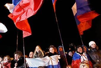 Miles de ciudadanos de Simferopol, la capital de Crimea, se congregaron en en la Plaza central de la ciudad para mostrar su satisfacción tras anunciarse los resultados parciales del referendo.