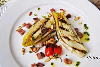 Ingredientes para 4 personas: 4-6 endivias100 gr. de jamón curadoUnos piñonesPara la vinagreta: 1 c/p de orégano2 tallos de cebollinoUna ramita de romeroSal, pimienta negra15 cc. de vinagre45-50 cc. de aceite de oliva virgen extra