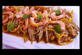 3.- En una fuente ponemos las endivias salteadas. Disponemos sobre ellas los langostinos. Vertemos el caldo de las envías cocinadas y la salsa de naranja de langostinos. Le añadimos unos nueces picadas por encima. Decoramos el plato con las hojas de hierbabuena y las tiras de la piel de la naranja. Servimos el plato caliente.