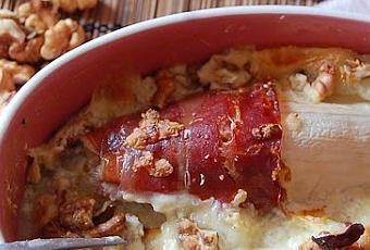 4 lonchas de pan de molde sin corteza.100 ml. de vino blanco.8 lonchas de jamón serrano.4 endivias.125 grs. de queso azul.2 huevos.250 ml. de nata liquida para cocinar.100 grs. de mozzarella.Nueces. Sal y pimienta.Mantequilla para engrasar el molde.