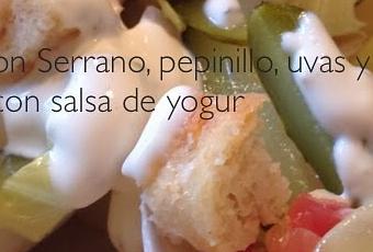 Colocamos en el centro de las hojas, las otras cortadas. Esparcimos el jamón, los pepinillos , las uvas y los trocitos de pan . Y rociamos con la salsa de yogur.