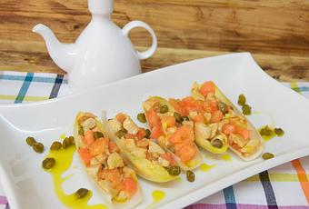 Rellenamos las hojas de las endivias, las vamos colocando en una fuente y cuando terminemos, le ponemos un chorreón de aceite por encima de las endivias.
