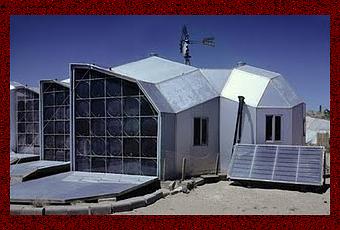 Casa solarEn esta casa solar en Corrales (Nuevo México, Estados Unidos) un colector solar de placa plana (inferior derecha) proporciona energía para calentar agua bombeada por el molino. El agua se almacena en grandes bidones.