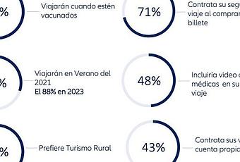 La disposición a viajar también crece: Si bien el 30% de los residentes en España están dispuestos a viajar este año, aumenta hasta el 49% cuando se les consulta si viajarían a principios del año 2022, y la curva va en ascenso hasta alcanzar el 88% para el 2023, generando optimismo en el sector. En cuanto a qué lugares visitarían, el 87% de los encuestados se inclinan por el turismo nacional, frente al 37% que estaría dispuesto a viajar a países del continente, siendo la primera opción Francia, seguida de Portugal e Italia.