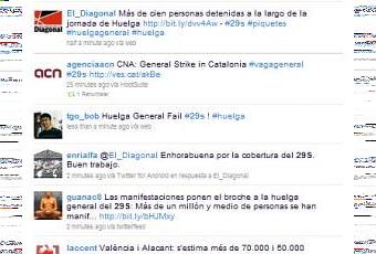 Ayer, a las 12:00 de la noche, entré en twitter y busqué el hashtag #29S. Me iba ya a dormir ( esperando el final del tercer capítulo de Los Pilares de la Tierra) y revisé el correo. Eso me llevó a entrar en Twitter y observé que había gente que estaba descontando el tiempo para las 24:00 y, por lo tanto, el incio de la jornada de Huelga General. Me pudo la curiosidad y a la medianoche ( más o menos), entré de nuevo en Twitter. El hashtag #29S iba a toda leche. Se iban desplegando nuevos tweets cada pocos segundos : se reproducían noticias de los medios o se describían situaciones locales. Así, me enteré que en Madrid ya no había tele autonómica, que en Mercabarna ya se empezaba a bloquear a los camiones, que habían atropellado a una piquete informativa, que quemaban containers en Paterna, que el diario Público había hecho una portada- huelga muy original ( para ser una huelga, un derroche de creatividad digna de elogio), que los autobuses , que los piquetes… La verdad, me fuí a dormir intranquila, pensando que había una dosis de nerviosismo extremo en el día que venía. Durante la jornada, he ido consultando los tweets. La normalidad que se ha vivido , en general, también se reflejaba allí aunque , gracias a esta tecnología 2.o, también he podido conocer los casos de violencia y la extraña situación que ha vivido Barcelona cuando un grupo de impresentables ( sin nada que ver con la protesta de los trabajadores) se han dedicado a destrozar la ciudad .