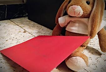 Bravo. Lo había encontrado.Sobre el capó del coche encontró el sobre y decidió no abrirlo, llevarlo a casa y entre todos resolverlo. Pero Conejito es un cotilla, lo abrió con cuidado y leyó la pista. Jijijiji. A Travis le va a encantar este enigma.