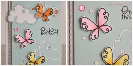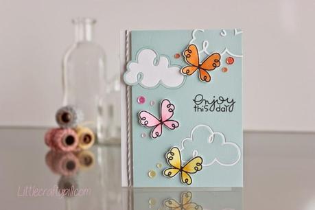 Hi there! It's been a while since the last time I played along with Paper Smooches Sparks, so here I go! This is an any-occasion card that I created with the stamp set "Flap Happy" and the "Curly Clouds" dies. And by the way...I just noticed a flaw in my card that is driving me crazy, can you spot it? I have fixed it in real life but I don't have time to change the picture now! Too bad :(