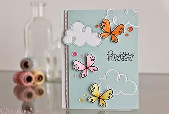 Hi there! It's been a while since the last time I played along with Paper Smooches Sparks, so here I go! This is an any-occasion card that I created with the stamp set "Flap Happy" and the "Curly Clouds" dies. And by the way...I just noticed a flaw in my card that is driving me crazy, can you spot it? I have fixed it in real life but I don't have time to change the picture now! Too bad :(
