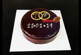 Mousse de chocolate negro 64% de cacao, esponjoso de vainilla caramelizado, bizcocho de nuez pecan y chocolate negro cruijiente de nuez pecan, decorado con chocolate blanco y colorante alimentarios.