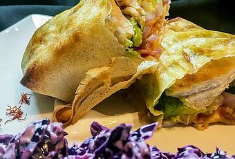 Disponemos una lámina de pasta filo en la superficie de trabajo, la untamos con un poco de aceite, ponemos otra lámina encima y volvemos a pintar con aceite y terminamos con otra lámina. Dividimos la carne de pollo en cuatro partes y la ponemos sobre la pasta filo de forma rectangular de unos 10cm de largo por 5 de ancho con cada parte.