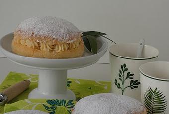 Cortamos cada ensaimada con la mitad en horizontal, rellenamos con la crema pastelera, tapamos y espolvoreamos azúcar glas por encima.