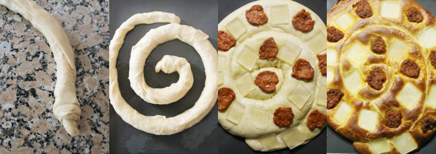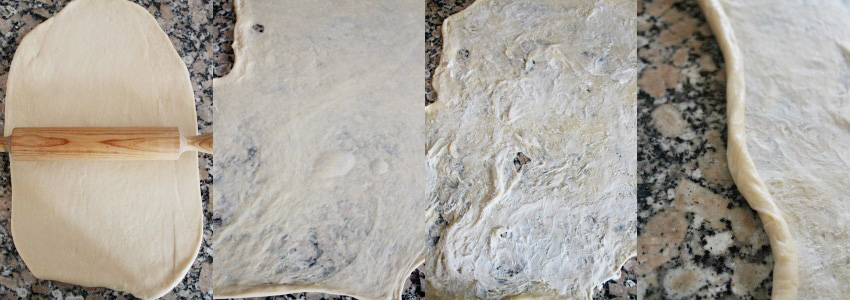 Untamos la manteca sobre la masa de la ensaimada y la enrollamos por el lado mas largo hasta formar un churro grande.Estiramos las puntas para darle una forma un poco más fina. Untamos la bandeja de horno con aceite y enrollamos la masa de la ensaimada sobre ella en el sentido de las agujas del reloj, sino no se considera ensaimada. Entre cada vuelta dejamos el suficiente espacio para que la masa crezca al fermentar (como en la foto 2).