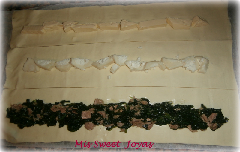 Con el rodillo estiramos la masa de hojaldre y con el cuchillo la cortamos en tres trozos. En uno puse quesitos a trozos, en el otro queso de cabra y el tercero las espinacas (previamente escurridas, para que no quede aceitoso).
