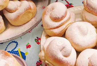 Colocar sobre bandejas. Fermentar hasta que triplique el volumen inicial. Hornear a 220º durante 10 minutos. Una vez frías, espolvorear con azúcar glass.